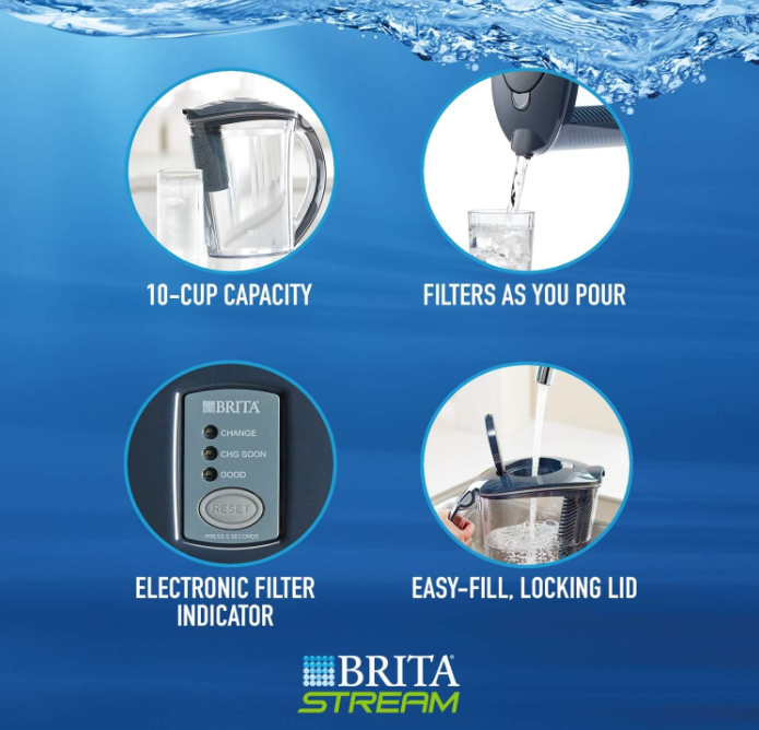 The 10-cup Brita Rapids Stream® Water Pitcher features Filter-As-You-Pour™ Technology—no more waiting at the sink! System is made without BPA.