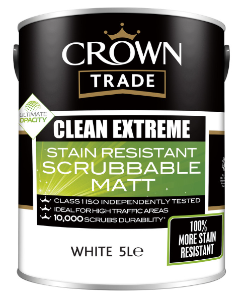 Need a true matt finish that’s tough enough for use in the busiest areas? Look no further than Crown Trade Clean Extreme Scrubbable Matt – it’s up to 100% more stain-resistant than conventional matt vinyl emulsion.