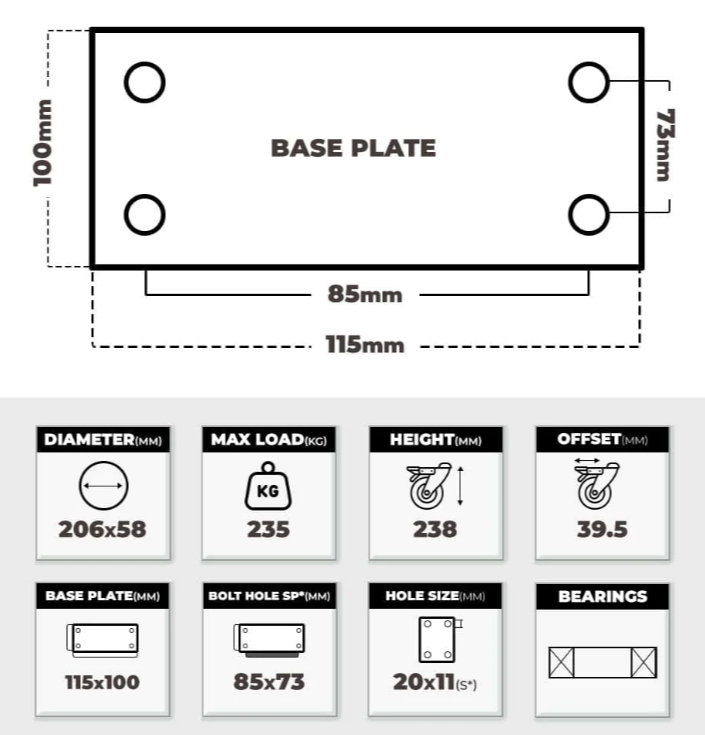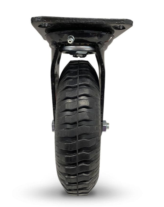 Black baked enamel finished fabricated steel componentry with steel core centred, solid rubber outer wheel with double ball bearings.