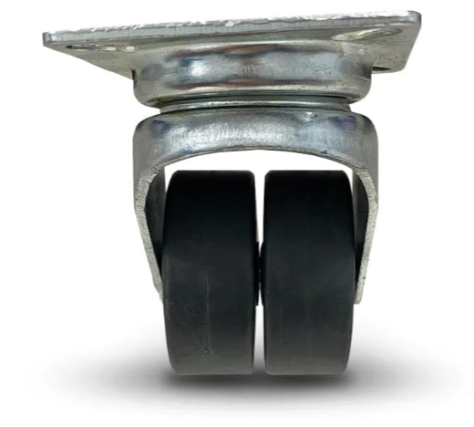 Nickel plated pressed steel componentry with steel core centred, grey coloured thermoplastic rubber wheels with quality roller bearings.
