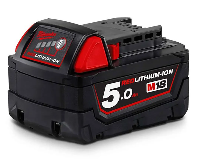 The M18™ 5.0AH REDLITHIUM-ION™ BATTERY features superior pack construction, electronics, and performance to deliver more work per charge and more work over the life of the pack than any battery on the market. M18™ 5.0AH REDLITHIUM-ION™ BATTERY features an advanced design, protecting the pack against harsh jobsite environments. This protection routes water away from the electronics and out of the battery pack, extends run-time and life by minimizing heat, and prevents pack failures from vibration or drops.