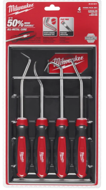 The 4pc Hose & pick set feature an all-metal core for up to more durability. Each pick has a specific angle for different applications whilst the reinforced tip resists bending when loosening stubborn hoses. The flat pick provides puncture protection and reduces damage to hoses. Our Comfort grip handles gives the user increased tool control and comfort. This set features a hook, 90°, 45°, and flat hose pick along with a durable long-term storage tray for easy access and organisation. These chrome-plated picks provide superior rust protection.